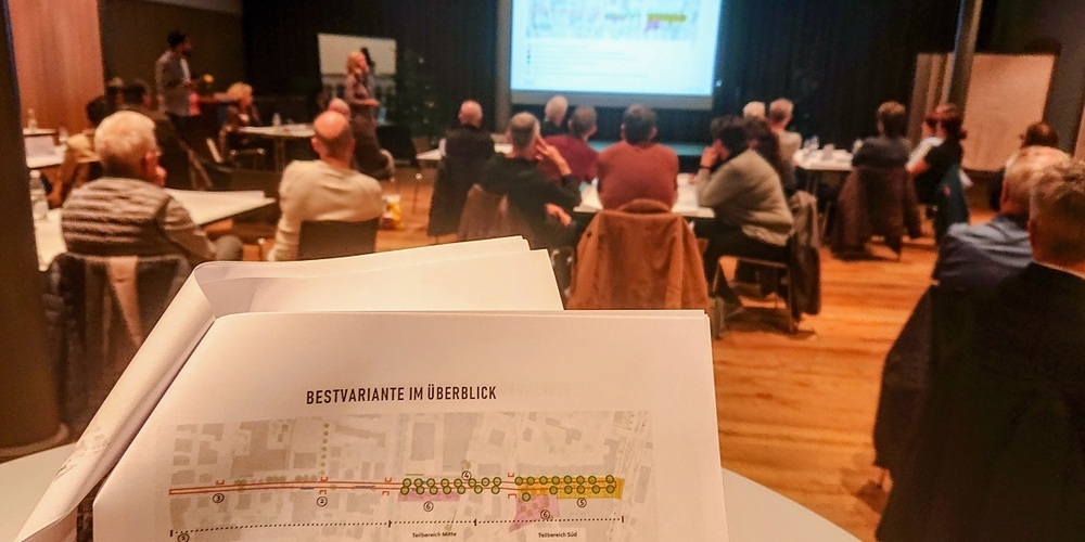 Moderatorin Petra Neff, Stadtentwicklerin Monika Schenk und Verkehrsexperte Silvan Nigg erläuterten den Werdegang zur "Bestvariante" und stellten diese vor.