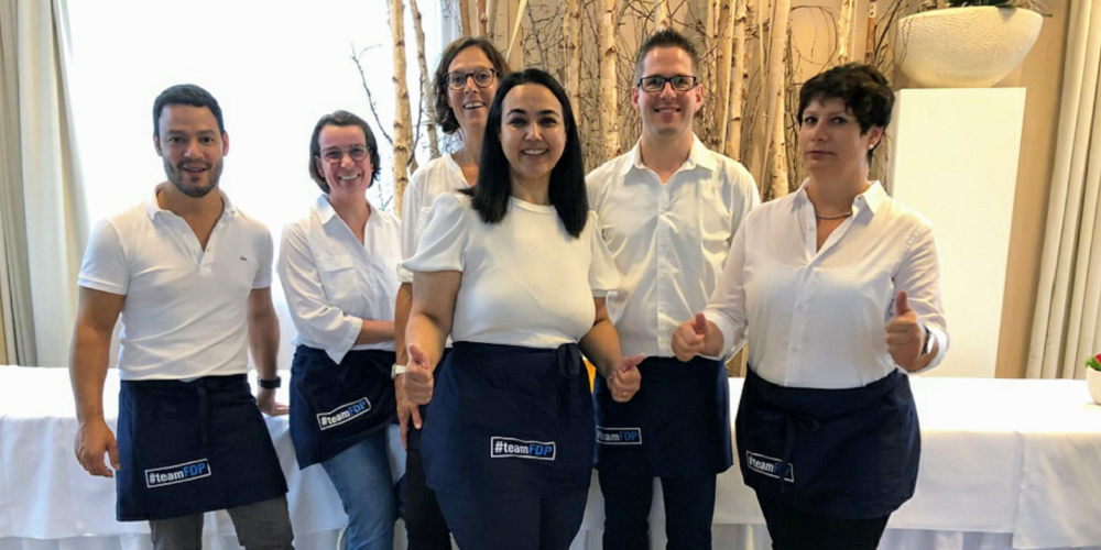 Die Kandidierenden trugen dabei eine eigens dafür hergestellte FDP-Schürze. Bei den Gästen kamen die neuen Service-Aushilfekräfte sehr gut an. Die Gelegenheit wurde ge-nutzt, um die Kandidierenden während zahlreicher Gespräche besser kennenzulernen oder einfach mal nur in Action zu erleben. Auch Nicht-Gossauer zeigten sich interessiert an den aussergewöhnlichen Aushilfekräften.