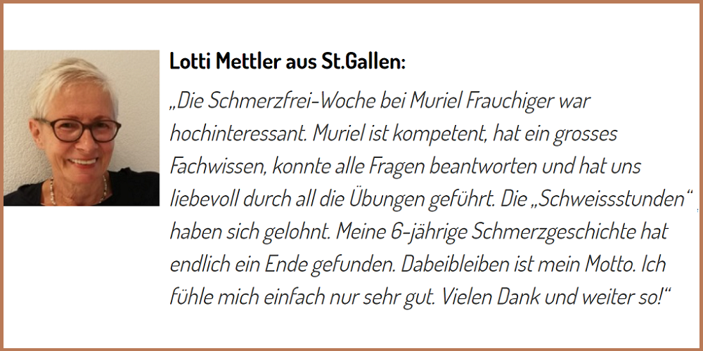 Als Eidg. Dipl. Turn- und Sportlehrerin, mit Studium an der ETH Zürich und Schmerz- und Bewegungsspezialistin nach Liebscher & Bracht, bringt Muriel Frauchiger-Jourdain langjährige Erfahrung mit und darf sich mittlerweile an zahlreichen zufriedenen Kunden erfreuen. Dies in Ihrer Praxis nach individuellen Behandlungen oder nach Schmerzfrei-Wochen in Zusammenarbeit mit der Tanz- und Gymnastikschule Perron1 in Oberbüren. Im Mittelpunkt stehen dabei individuelle und alltagstaugliche Lösungen gegen Schmerzen und Spannungszustände.