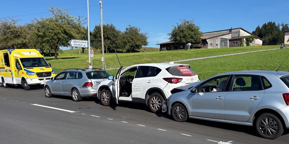 Am Montag, 25. August 2025, kurz nach 16:30 Uhr hat sich auf der Bischofzellerstrasse, Höhe Verzweigung Albertschwilerstrasse, ein Auffahrunfall mit drei beteiligten Autos ereignet.