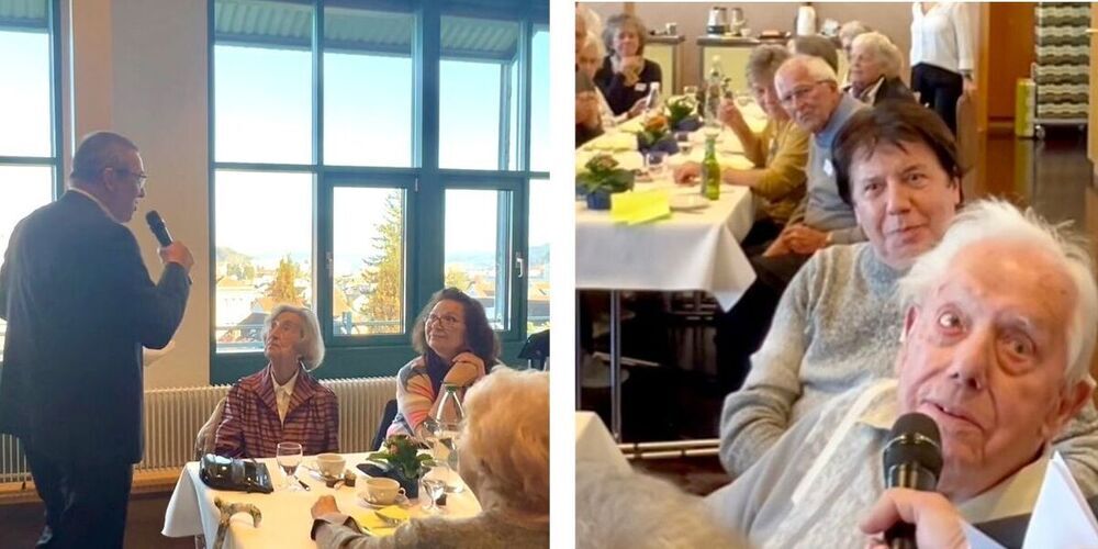 Ein besonderer Höhepunkt war die Begrüssung von Edith Gubser und Theodor Schmidhauser, die beide stolze 101 Jahre alt sind! Wolfgang Giella fragte sie nach dem Rezept für ein so langes Leben. Theodor Schmidhauser antwortete ohne zu zögern: «Nicht übertreiben.» Edith Gubser riet zu Gottvertrauen – «jeden Tag», wie sie sagte. Anschliessend erinnerte Wolfgang Giella an berühmte Zeitgenossen. Nachdem alle 98-Jährigen namentlich erwähnt worden waren, fragte er in die Runde, wer in Gossau aufgewachsen sei, wer der Liebe wegen zugezogen sei und wer wegen der Arbeit.