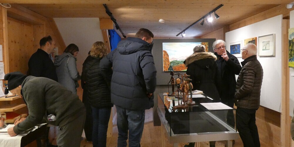 Wie meistens ist der Andwiler Künstler Josef Signer auch an diesem Sonntagnachmittag vor Ort und nimmt sich Zeit für Gespräche mit Besucherinnen und Besuchern. Er erzählt, dass er seit rund 25 Jahren malt, aber eigentlich schon immer kreativ gewesen sei. So habe er beispielsweise für seine Kinder früher Holzspielzeug selbst gefertigt. Von ihm sind etwa 40 Arbeiten aus den vergangenen 15 Jahren ausgestellt: Malerei, Drucke, Collagen, Skulpturen. Die grosse Vielfalt an Sujets, Materialien, Techniken und seine Kunstfertigkeit sind beeindruckend.