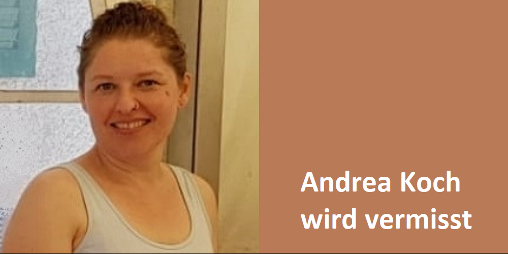 Die 35-jährige Vermisste ist 159 cm gross, von schlanker Statur und hat schulterlange, dunkelblonde Haare, die sie wahrscheinlich zusammengebunden trägt. Sie hat ein Muttermal unterhalb des linken Auges. Die Vermisste trägt ein Nasenpiercing sowie unterhalb der Unterlippe einen Steinchenstecker. Koch Andrea hat am Hals und am Nacken Tätowierungen. Sie ist bekleidet mit einer weissen Jacke und braunen Hosen und hat möglicherweise einen kleinen Rucksack bei sich. Koch Andrea dürfte unter dem Einfluss von Medikamenten stehen und benötigt dringend ärztliche Hilfe.