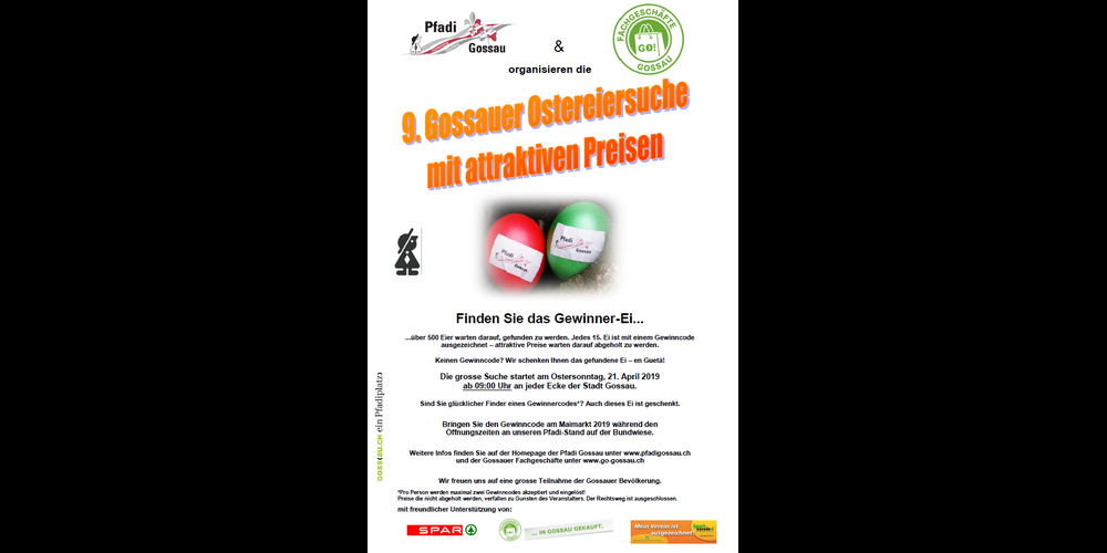 Nun bereits schon zum neunten Mail findet am Ostersonntag, 21. April 2019, die Gossauer Ostereiersuche statt. Die Fachgeschäfte Gossau und Umgebung und die Pfadi Helfenberg-Oberberg Gossau veranstalten gemeinsam diese beliebte Ostereiersuche. Es warten 75 attraktive Preise!