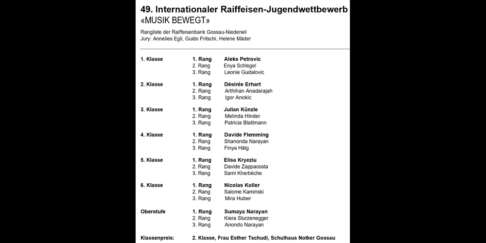 Die Jury, zusammengesetzt aus der Künstlerin Annelies Egli, dem ehemaligen Lehrer Guido Fritschi und der Künstlerin Helene Mäder, hatte wiederum keine leichte Aufgabe, die Gewinner zu ermitteln. Das vorgegebene Thema war sehr offen formuliert und liess den Schülerinnen und Schüler viel Spielraum, ihre Ideen und Vorstellungen phantasievoll und kreativ umzusetzen. Pro Klassenzug dürfen sich die ersten drei Ränge über ein Sackgeld freuen. Die 2. Klasse von den Lehrerinnen Esther Tschudi und Monica Morosi der Schule Notker sicherte sich den Klassenpreis. Sie darf sich auf das Nachtschwärmer-Programm im Walter Zoo mit Lagerfeuer und Übernachtung im Tipizelt freuen.