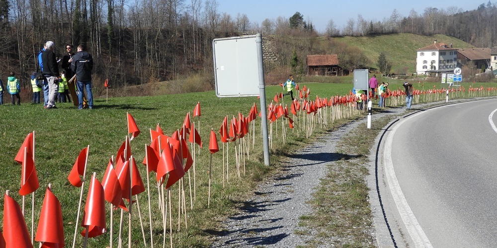 Die 4. Klasse von Monika Brühwiler steckte innerhalb von wenigen Minuten 500 Fähnchen in die Wiese von Landwirt Gottfried Röthlisberger. Die Aktion «Abfall sichtbar machen», der Stadt Gossau gemeinsam mit dem St. Galler Bauernverband, fand bereits zum vierten Mal statt. Für jede Aludose, jeden Zigarettenstummel und jeden Plastiksack wurde ein rotes Fähnchen gesteckt. All die roten Fähnchen, die nun auf der Wiese zwischen Gossau und Flawil im Wind wehen, stimmen nachdenklich. Welch Unmengen von Kosten allein die Reinigungsarbeiten im öffentlichen Raum verursachen, und dies nur, weil einige Menschen ihren Abfall gedankenlos aus dem Autofenster werfen. Auch für die Schülerinnen und Schüler ist dieses Verhalten nicht nachvollziehbar. Sie wünschen sich, dass die Bevölkerung mehr Acht auf die Umwelt gibt.