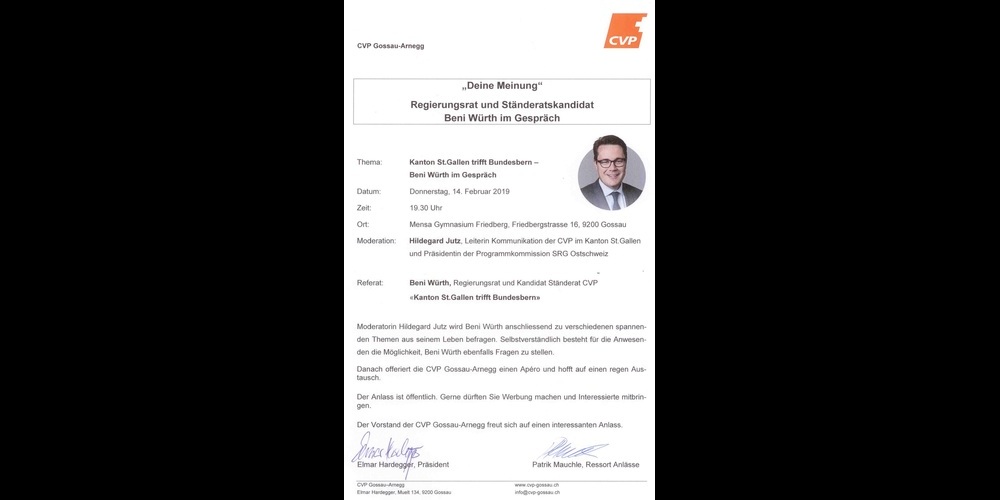 Die CVP Gossau-Arnegg organisiert am 14. Februar 2019 einen öffentlichen Anlass, bei dem der Ständeratskandidat, Beni Würth, zum Thema «Kanton St. Gallen trifft Bundesbern» referiert und anschliessend von Hildegard Jutz interviewt wird.