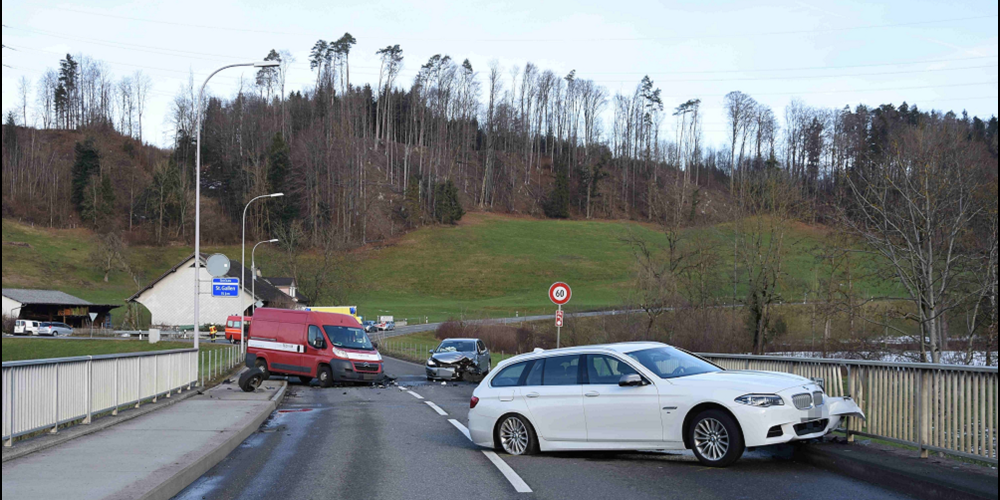 (Kapo SG) Ein 78-Jähriger fuhr von Flawil Richtung Gossau und geriet aus bisher unbekannten Gründen Höhe Bruggwis auf die Gegenfahrbahn. Dort kollidierte sein Auto mit dem Auto eines korrekt entgegenkommenden, 71-jährigen Mannes. Anschliessend wurde das Auto des 78-Jährigen abgewiesen, prallte gegen den Randstein und ein Brückengeländer, wurde wieder auf die Gegenfahrbahn abgewiesen und prallte in den Lieferwagen eines ebenfalls korrekt entgegenkommenden, 25-jährigen Mannes. Der 78-jährige Autofahrer sowie seine zwei Mitfahrerinnen und der 71-jährige Autofahrer wurden dabei eher leicht verletzt. Sie wurden vom Rettungsdienst mit drei Rettungswagen in umliegende Spitäler transportiert. Bei den drei Fahrzeugen entstand ein Sachschaden von rund 50'000 Franken.Aufgrund des Unfalls musste die Flawilerstrasse für rund drei Stunden gesperrt werden.