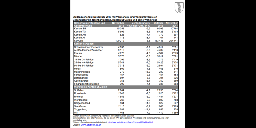 Ende November 2018 waren im Kanton St.Gallen 10‘053 Stellensuchende bei einem Regionalen Arbeitsvermittlungszentrum gemeldet. Das sind 454 mehr als im Vormonat. Gegenüber dem Vorjahresmonat, dem November 2017, sind es rund 700 Personen oder sieben Prozent weniger. Damit hat sich die abnehmende Tendenz im Kanton St.Gallen abgeschwächt und derjenigen in der ganzen Schweiz angeglichen. Im Thurgau und in den beiden Appenzell ist die Zahl der Stellensuchenden im Vorjahresvergleich stärker gesunken.