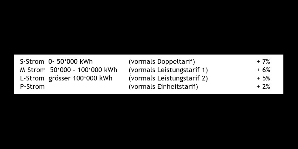 Die Einteilung in die verschiedenen Tarifgruppen erfolgt neu einzig nach dem Jahresstrombezug. Die Stromnutzung für Wohnen, Landwirtschaft oder Gewerbe, hat neu keinen Einfluss mehr auf die Einteilung. Die Bezugsleistung (Maximum) wird einzig in den Tarifgruppen M-STROM und L-STROM berücksichtigt und verrechnet. Das neue Preisblatt STROM 2019 kann auf der Homepage der Gemeinde (www.waldkirch.ch) abgerufen oder direkt bei den Technischen Betriebe Waldkirch (tbw@waldkirch.ch) bestellt werden.
