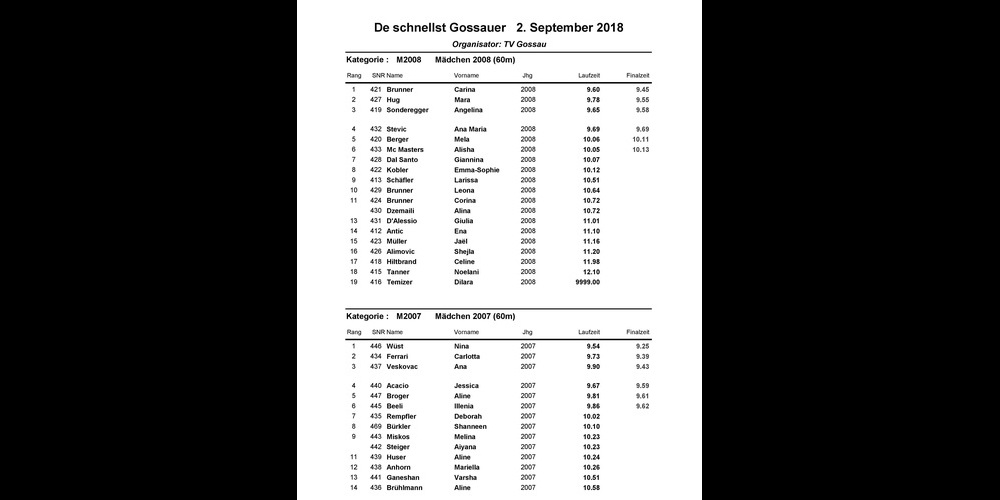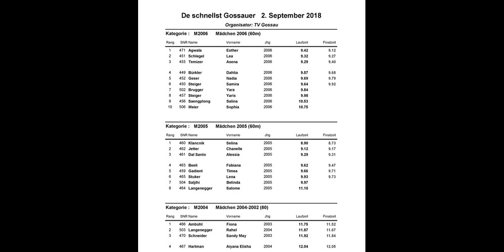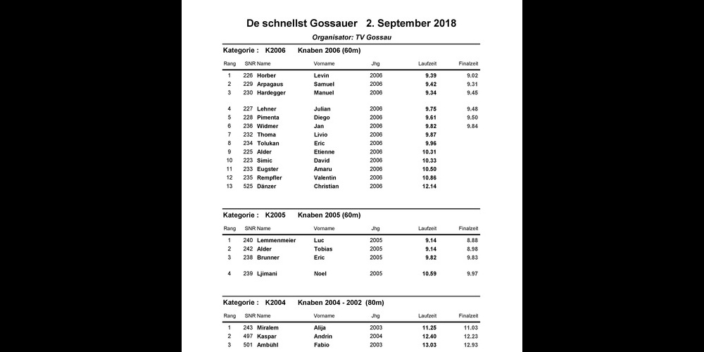 Ranglisten 34. "De schnellst Gossauer" Einzel nach Altersklassen