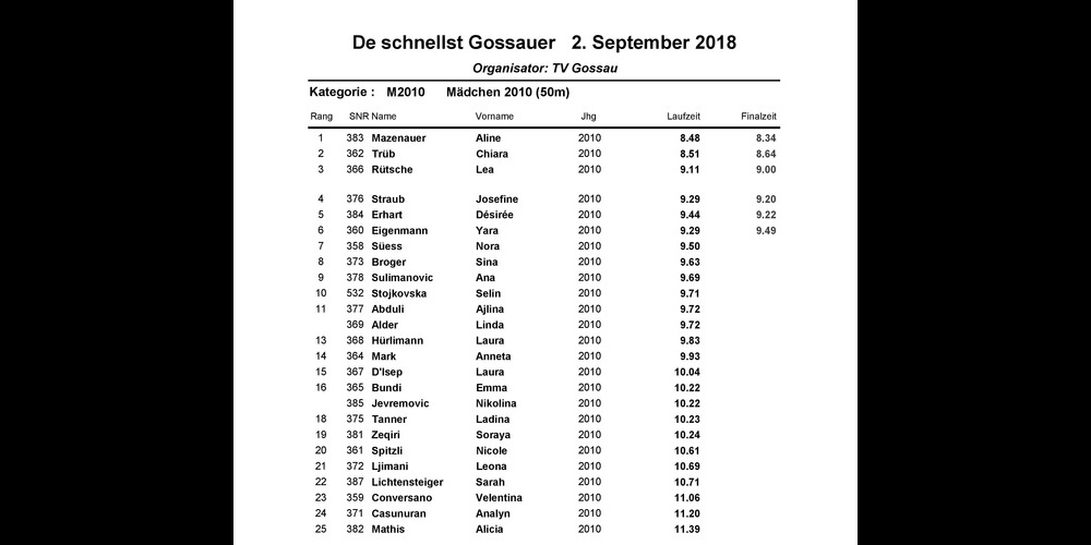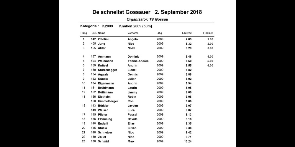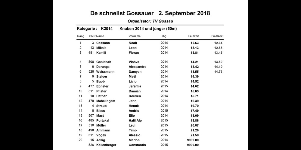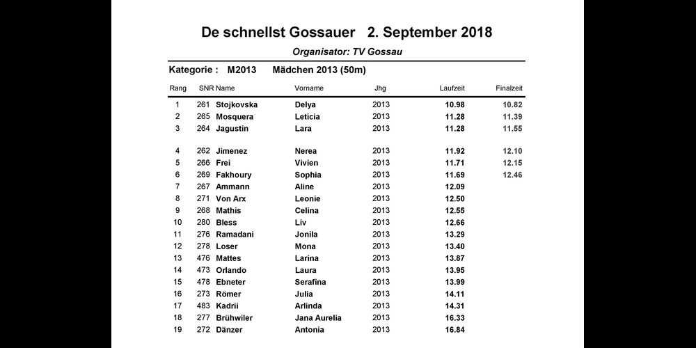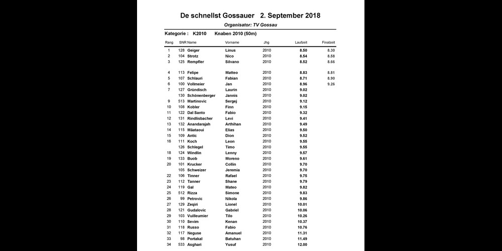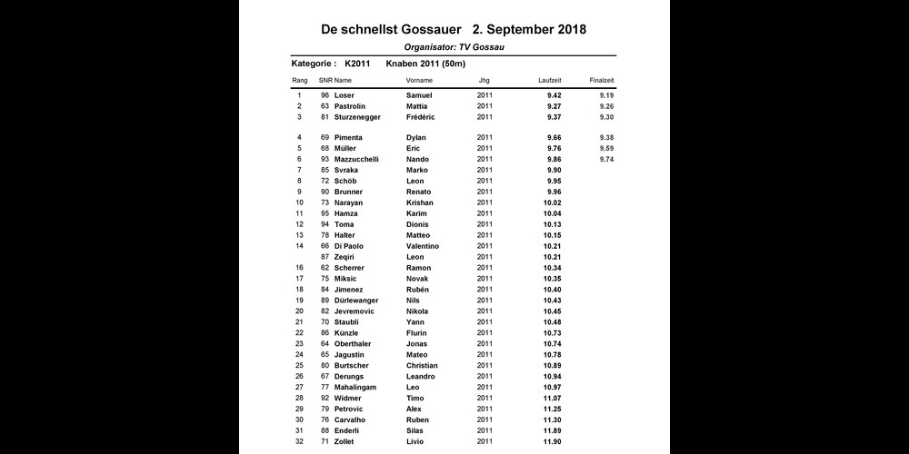 Das kühle Wetter und der bedeckte Himmel waren für die Sprinterinnen und Sprinter beinahe ideal, für das Rahmenprogramm mit Spielen und Festwirtschaft hätte man sich sommerlicheres Wetter zurückgewünscht. Die vom TV Gossau organisierte 34. Ausgabe "De schnellst Gossauer" vom 2. September 2018 war trotzdem ein voller Erfolg und die gezeigten Leistungen überzeugten.