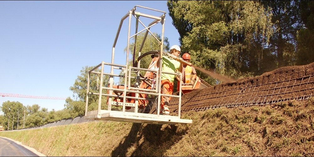 Um die steilen Böschungen zu begrünen, wurde die Saat aufgespritzt. Als Erosionsschutz setzte man darunter kein Vlies ein – was man früher gemacht hatte – sondern ein sogenanntes Wirrgelege. Dieses Strukturgewebe sorgt dafür, dass die Ansaat hält und die Pflanzen richtig verwurzeln. Um die Vegetation vor dem Austrocknen zu schützen, wurde letztlich noch eine Kokosfasermatte aufgelegt. In einem grünen Lärmschutzdamm, dem der Durchschnittslenker beim Vorbeifahren wohl kaum Beachtung schenkt, steckt also ganz schön viel Know-how.