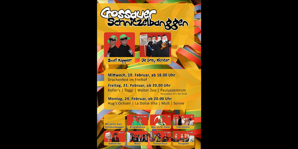 Die Gossauer Schnitzelbanggen sind ein fester Bestandteil der hiesigen Fasnacht. Seit Jahrzenten dichten sie Verse zur aktuellen Politik und wichtigen Ereignissen im Sport oder in der Gesellschaft. So werden sie auch dieses Jahr wieder für beste Unterhaltung sorgen. Traditionell werden die beliebten Lokalmatadoren «Zwei Räppler» und «Die Drey Richter» von den «Alliglattohren» aus Flawil, den «Trompf Buur» aus Herisau, «Gallomisto» aus St. Gallen, den «Thurgeiern» aus Bischofszell und weiteren Gast-Schnitzelbanggen begleitet.