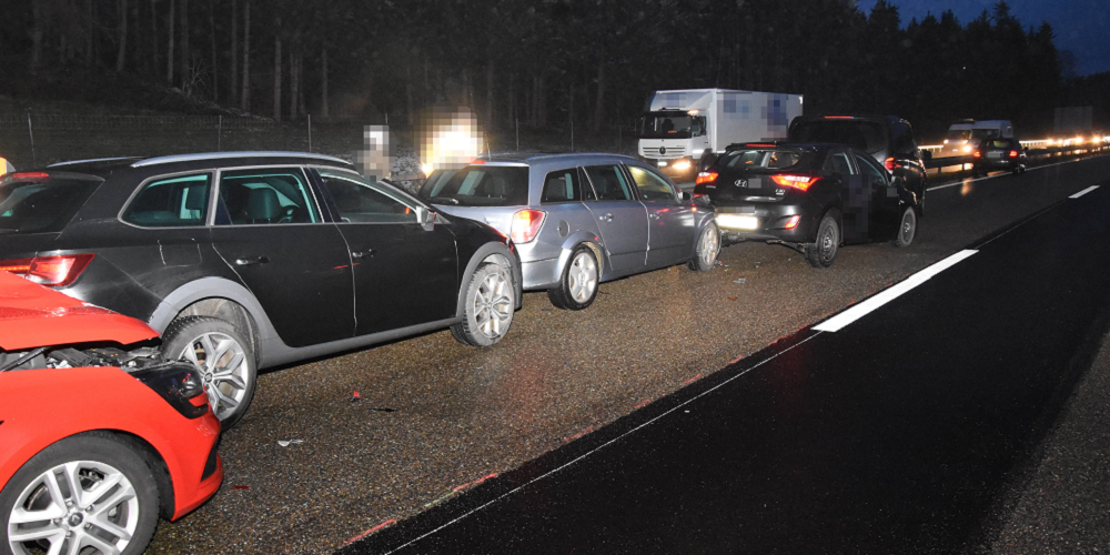 Eine 24-Jährige, ein 37-Jähriger, ein 51-Jähriger, ein 60-Jähriger, ein 29-Jähriger und ein 26-Jähriger fuhren mit ihren Autos in genannter Reihenfolge auf der Überholspur. Zu dieser Zeit herrschte ein grosses Verkehrsaufkommen. Die 24-jährige Frau, welche zuvorderst fuhr, musste ihr Auto verkehrsbedingt bis zum Stillstand abbremsen. Der nachfolgende Autofahrer konnte nicht mehr rechtzeitig bremsen und sein Auto kollidierte mit dem Heck des Autos der 24-Jährigen. In der Folge kam es zu diversen Nachfolgekollisionen in die insgesamt sechs Autos involviert waren. Für die Bergung der Autos mussten der Normal- und der Überholstreifen für kurze Zeit gesperrt werden. Dies löste einen grösseren Rückstau aus. Der 26-Jährige hat sich bei der Kollision leicht verletzt und suchte selbständig einen Arzt auf. Der Sachschaden beläuft sich auf über 50'000 Franken.