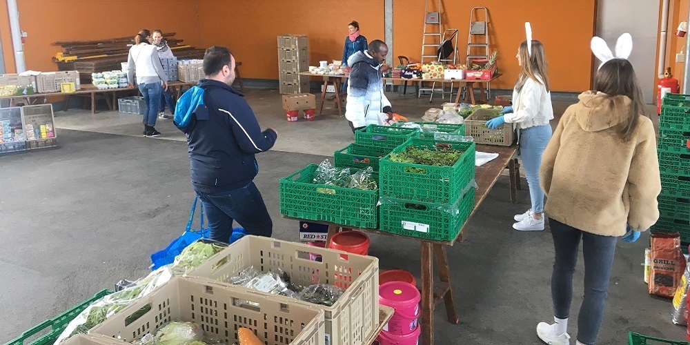 Da die Abgabe aufgrund der engen, räumlichen Verhältnisse im Friedegg-Treff nicht mehr möglich war, wurde die Verteilung in die Markthalle verlegt. Hier können die Begegnungsdistanzen eingehalten und dank vielen, auch neuen, freiwilligen Helferinnen und Helfer weiterhin sichergestellt werden.