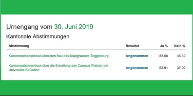 (sg.ch) Die Stimmbevölkerung des Kantons St.Gallen hat die beiden Vorlagen zum Bau des Klanghauses Toggenburg und der Erstellung des Campus Platztor der Universität St.Gallen angen...