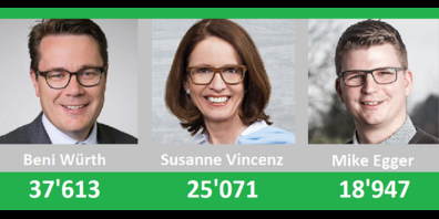 Im 2. Wahlgang für die Ständeratsersatzwahl von heute 19. Mai 2019 wurde der Favorit Beni Würth (CVP) mit 50'669 Stimmen (41,2%) gewählt, gefolgt von Susanne Vinzenz-Stauffacher (F...