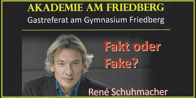 Das Gymnasium Friedberg lädt am Montag, 20. März 2023, um 19:30 Uhr in der Mensa zum Gastreferat "Fakt oder Fake?" von René Schuhmacher ein. Der Rechtsanwalt und Herausgeber von "K...
