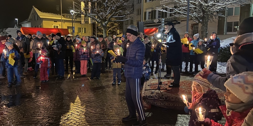 Rund um die drei Lichtersterne trafen sich am Samstagabend, 17. Dezember 2022, Jung und Alt in grosser Zahl auf dem Oberuzwiler Dorfplatz. Kurz vor Weihnachten erlebten sie Gemeinschaft bei Gesang, Musik, Vorlesungen und einem Märchen. Heisse Getränke, Guetzli und ein Geschenk für die Kinder machten den adventlichen Anlass zum Fest.