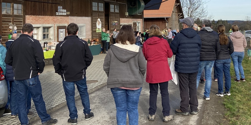 Zahlreiche Zuhörer und gute Stimmung schon am ersten "Etappenort" bei der Familie Ackermann auf dem Hof Storchegg.
