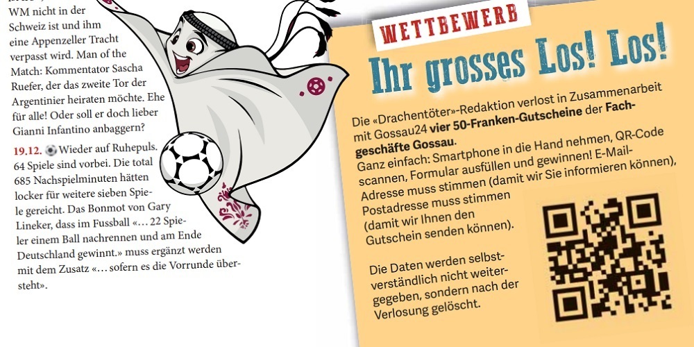 Die Drachentöter-Redaktion verlost in Zusammenarbeit mit Gossau24 vier 50-Franken-Gutscheine der Gossauer Fachgeschäfte. Der QR-Code im "Drachentöter 2023" erhielt zu viele Abfragen und gab seinen Geist auf. Hier der Link zur Verlosung, die noch bis am 28. Februar 2023 läuft. Machen Sie mit und gewinnen Sie!