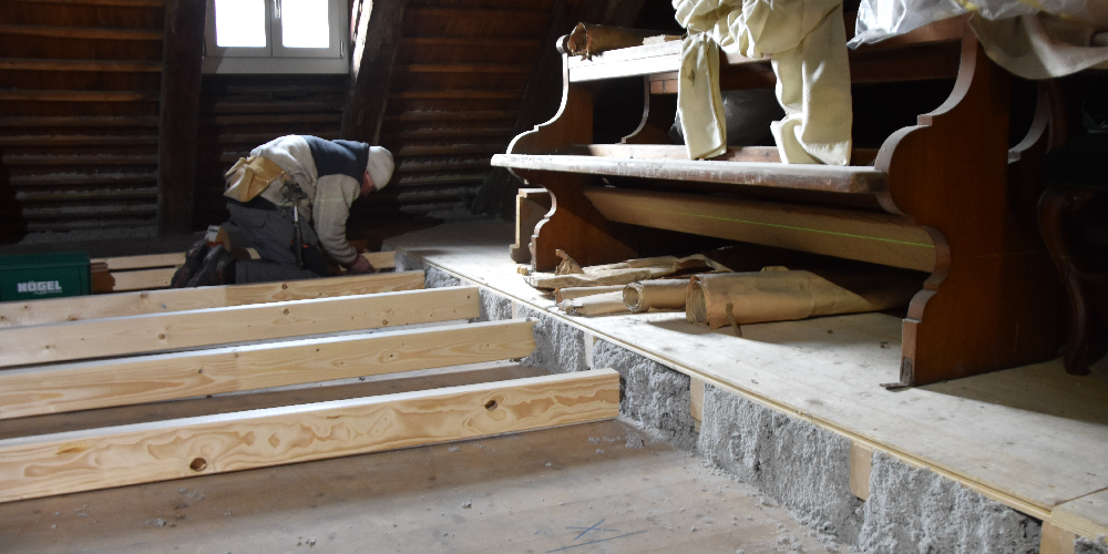 Die Unterkonstruktion dieses neuen Bodens besteht aus tragenden Holzlatten, auf welche die Schalung geschraubt wird. Die Hohlräume im Boden werden sodann mit Zellulose – also zerfasertem Zeitungspapier – aufgefüllt. Diese blasen die Handwerker mittels eines grossen Schlauchs in die Hohlräume hinein. Sämtliche Hohlräume müssen fugenlos und mit einer möglichst gleichmäßigen Verdichtung befüllt und damit wärmegedämmt sein. Alles in allem sind für den Estrichboden rund fünf Tonnen Zellulose notwendig. Zimmermann Jonas Bertsch von der ausführenden Firma Sutter AG Holzbau hält fest, dass Zellulose ein sehr häufig zur Wärmeisolierung gebrauchtes Material sei, weil es gut Feuchtigkeit aufnehmen und wieder abgeben könne.