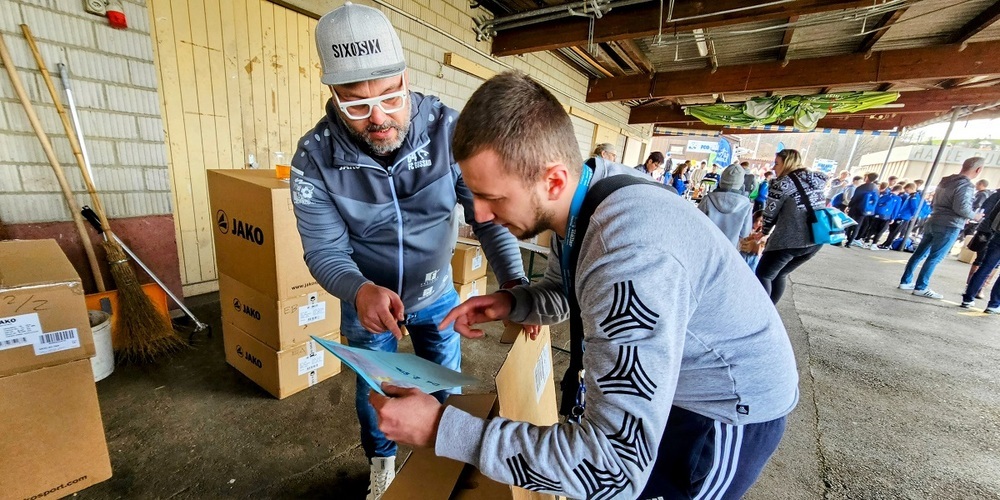 Verteilung der Hoodies an die Spielerinnen und Spieler.