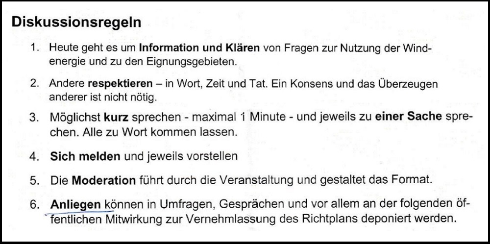 Nachdem die Regierungsrätin Susanne Hartmann in einem vorbereiteten Interview mit dem professionellen Moderator ihre Lobreden auf die Windenergie schwingen konnte, wurde dem erstaunten Publikum mitgeteilt, dass es sich jetzt auf vier Themen-Stationen verteilen solle, wo es von Fachleuten informiert werde. Es ginge auf dieser Veranstaltung um Fragen und Information, Meinungen wären dagegen nicht erwünscht, die könnte man erst später in der öffentlichen Mitwirkung einbringen. Die Besucher sollten halbstündlich zwischen den Stationen wechseln.