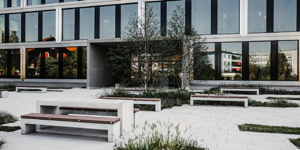 Das siebengeschossige ALPHA Building ist Bestandteil des Bebauungsplans Neufeld Baar. Das von Stephan Häuser AG aus Zug in Auftrag gegebene reine Bürogebäude wurde im Edelrohbau realisiert. Die lediglich durch 20 Elementstützen strukturierten Geschosse konnten durch die Mieterschaft frei nach ihren Bedürfnissen und Ansprüchen ausgebaut werden. Attraktiv, innovativ und kreativ sollen für die im ALPHA Building angesiedelten Unternehmen aber nicht nur die frei gestaltbaren und modernen Büroflächen sein, sondern auch das erweiterte Angebot, das von allen genutzt werden kann: Im Erdgeschoss befindet sich eine Food Area mit zahlreichen Verpflegungsmöglichkeiten. Ebenfalls im Erdgeschoss untergebracht ist ein Auditorium für Kurse, Generalversammlung, Weiterbildungen etc. Das grosszügige Treppenhaus wirkt in diesem Zusammenhang identitätsstiftend. Zudem ermöglicht ein privater Garten den Mitarbeitenden, auch Outdoor-Meetings durchzuführen – ein aussergewöhnliches Angebot, um Kreativität und Ideenfluss zu optimieren. In der Gartenanlage können die Mitarbeitenden ebenso den Mittag im Grünen geniessen wie einfach eine Verschnaufpause einlegen. Die Work-Life-Balance, so ist es auf der Homepage von ALPHA Building zu lesen, steht im Mittelpunkt des innovativen Bürogebäudes.
