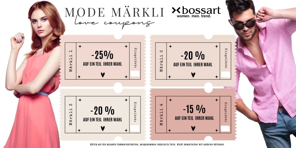 Drucken Sie die Märkli aus oder lassen Sie sich an der Kasse im Modehaus eine Rabatt-Markenkarte geben. Kaufen Sie ein und bestimmen nun, für welches Teil aus der Sommerkollektion Sie welchen Rabatt haben möchten. So macht Modeeinkauf doppelt Spass!