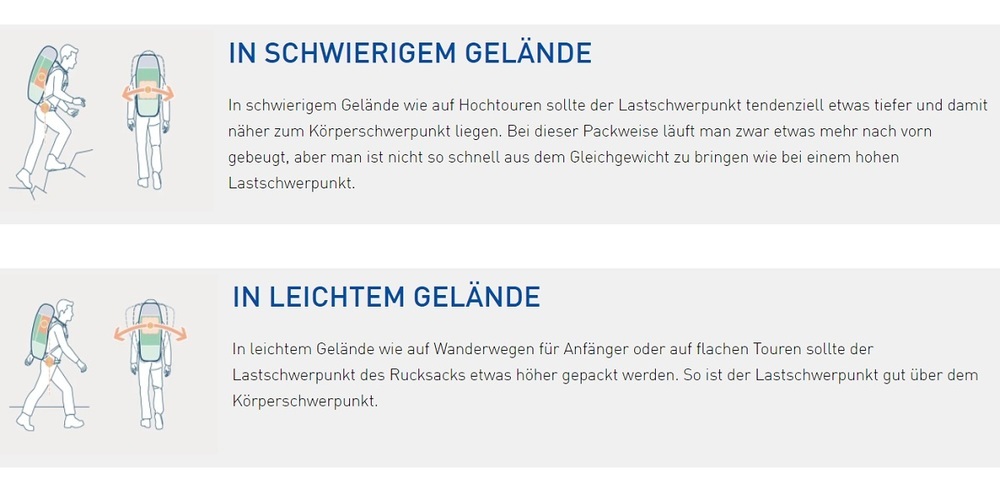 Der Lastschwerpunkt des Rucksacks sollte dicht am Körper, möglichst in Schulterhöhe liegen. So befindet er sich immer über dem Körperschwerpunkt und der Rucksack zieht beim Tragen nicht nach hinten.