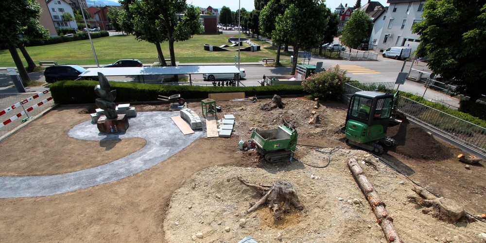Unter dem nördlichen Vorplatz des Rathauses befindet sich eine ehemalige Zivilschutzanlage, die auf absehbare Zeit erhalten bleibt. Mit dieser Umgestaltung wird kein Sachzwang geschaffen für mögliche Veränderungen durch das Gestaltungskonzept Bahnhofstrasse. Im nächsten Jahr soll auch der südliche Vorplatz aufgewertet werden. Mobiles Grün und ein Schattenbaum mit Sitzbänken sollen den Platz einladender machen.