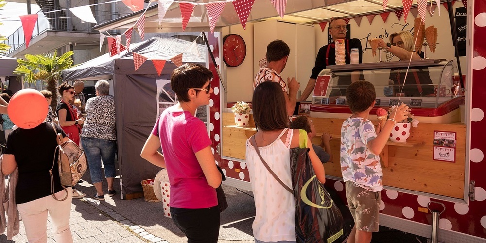 Ein unvergessliches Streetfood-Erlebnis bot die Holzofenpizza aus dem original Saurer-Truck. Die neapolitanisch inspirierte Köstlichkeit wurde frisch mit regionalen Zutaten aus Gossau zubereitet. Das einzigartige Pizzaschlemmen auf Rädern war nicht die einzige Attraktion – der auffallend bunte Glacéwagen sorgte zudem für Genuss direkt vom lokalen Bauernhof. Der Platz im sommerlichen Ambiente lud zum Verweilen an – ob an der Raiffeisen-Bar oder bei den «Tschütteli-Chäschte».