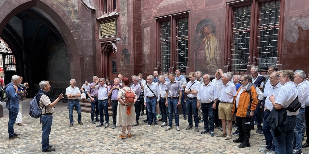 Nach der «Arbeit» folgte das Vergnügen in Form einer speziellen Tram-Fahrt durch das historische Basel mit Gesangshalt im Hof des Roten Rathauses (Bild) sowie dem Nachtessen im Zunfthaus zu Safran. Am Sonntag standen mit dem Besuch im Basler Hafen sowie der Brauerei Feldschlösschen zwei weitere interessante Punkte auf dem Reiseprogramm.