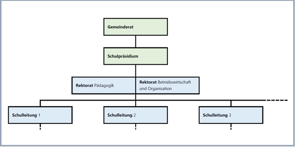Das neue Modell sieht keinen Schulrat mehr vor, dessen Aufgaben in den letzten Jahren immer mehr von den Schulleitern und Schulleiterinnen wahrgenommen wurden. Auch die Rolle der Schulratspräsidentin bzw. des Schulratspräsidenten wird neu fokussiert. Die aktuelle Mischung von politisch-strategischer und operativer Führung fällt weg, was sich auch in der Kürzung des Pensums auf 50% und im neuen Namen "SchulpräsidentIn" widerspiegelt. Die operative Führung liegt inskünftig bei einem Rektorat aus zwei Personen, die vom Gemeinderat gewählt werden. Eine ist zuständig für die pädagogische Leitung, die andere für die betriebswirtschaftliche Führung (siehe Organigramm).