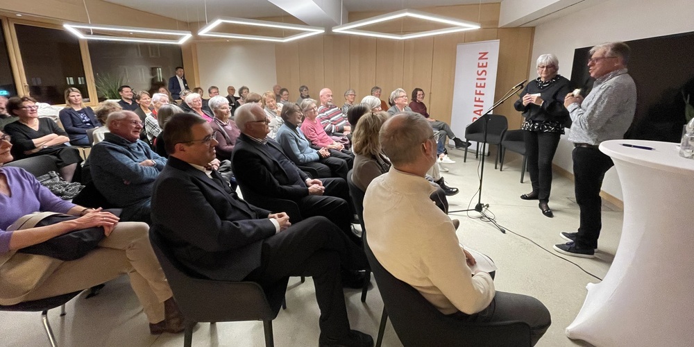 Der Vortragssaal der Raiffeisenbank Gossau ist bis auf den letzten Platz besetzt: Gespannt blickt das Publikum auf die Leinwand. Der Intro-Film der Vernissage zeigt die Entstehung des 2. Bandes „FrauenWege“ – von der Recherche über das Schreiben bis hin zum Lektorat und Druck. Behind the scenes wird gezeigt, wie viel Sorgfalt, Leidenschaft und Herz hinter dem Projekt stehen.