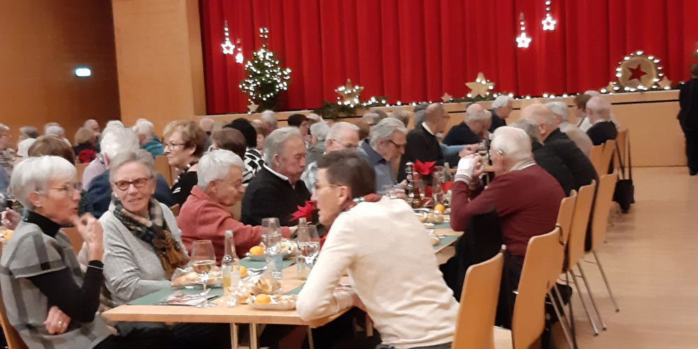 Wunderbar gedeckte Tische und der weihnächtlich geschmückte Saal sorgten von Anbeginn für eine festliche und gemütliche Atmosphäre. Der «Grittibänz» sowie die Nüssli, Schöggeli und Mandarinen, die alle beim Sitzplatz vorfanden, luden schon vor der offiziellen Eröffnung zum Naschen ein. Und natürlich wurde sofort überall eifrig geplaudert, denn das gemütliche Zusammensein ist ja eines der Hauptziele des Jahrgängervereins.