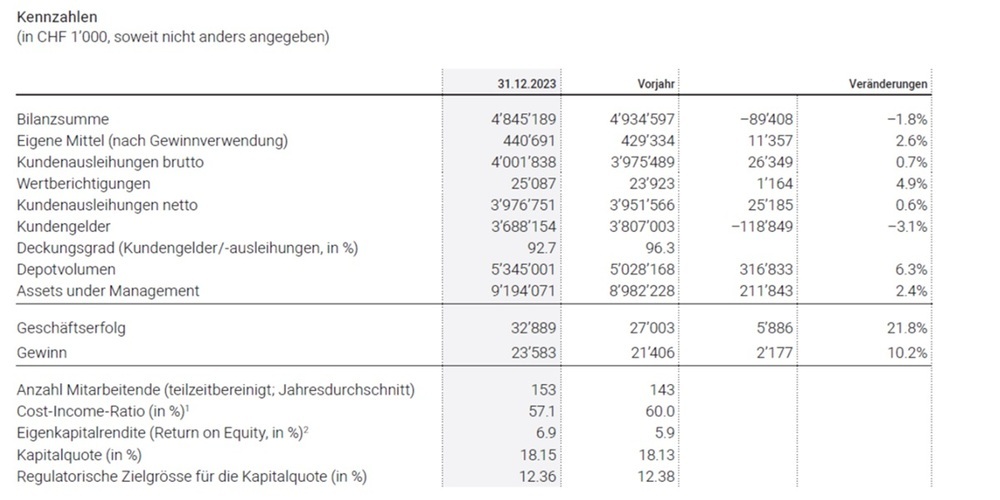 Der Geschäftsverlauf 2023 war geprägt vom Zinsanstieg. Dr. Michael Steiner, Vorsitzender der Geschäftsleitung: «Die tiefen bzw. negativen Zinsen drückten während vieler Jahre stark auf die Zinsmarge. Seit dem Ende der Negativzinsphase im September 2022 wurde zumindest ein Teil des Margenverlusts kompensiert.» Die Aufhebung der Negativzinsen, der nachfolgende Zinsanstieg und das Management der Bankbilanz führten zu einer ausserordentlichen Steigerung des Zinsergebnisses: «Der Brutto-Erfolg aus dem Zinsengeschäft stieg um CHF 14.3 Mio. bzw. 32 % auf CHF 59.2 Mio. Dies, obwohl wir zu den ersten Banken schweizweit gehörten, welche die Zinsen für Spargelder, Festgelder und Kassenobligationen zugunsten der Kundinnen und Kunden schon im Berichtsvorjahr erhöht haben. Dieser Philosophie blieben wir auch 2023 mit raschen Erhöhungen treu.»