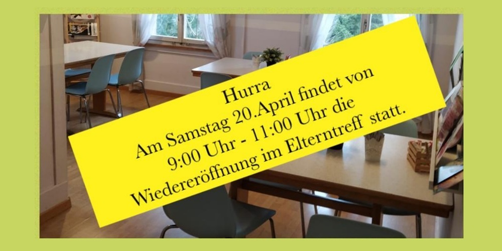 Unsere Wiedereröffnung feiern wir am Samstag, 20. April von 9 bis 11 Uhr. Alle sind eingeladen, dies mit uns zu feiern. Gleichzeitig dürfen auch die Räume der Spielgruppe besichtigt werden. Ab der Folgewoche ist der Elterntreff wieder jeweils am Dienstag- und Freitagmorgen von 9 bis 11 Uhr und am Dienstag-Nachmittag von 14 bis 16 Uhr geöffnet.