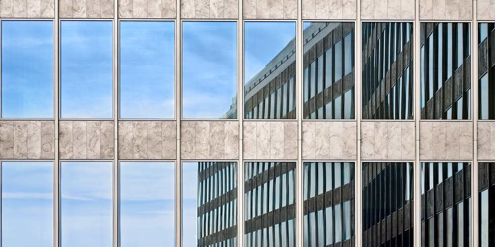 Ein wichtiger Aspekt im Rahmen des Projekts an der Müllerstrasse war die Wiederverwendung der bestehenden Aluminiumfassade. Die vorhandenen Gussaluminiumplatten wurden demontiert, aufbereitet und in neuer Form weitergenutzt: Aus den vorhandenen Platten wurden Streifen herausgeschnitten und rund um das Gebäude für die neue Brüstungsverkleidung eingesetzt. Überschüssiges Metall setzte man für die Gestaltung des Eingangsbereichs ein. Aus den alten Betonbalustraden der Fassade entstanden unterdessen neue Sitzgelegenheiten. Um dem neuesten technischen Standard zu entsprechen, erhielt die Fassade auf rund 3000 m² neue, grossformatige Scheiben aus dem Sonnenschutzglas eyrise® s350. Dank der angewandten Flüssigkristalltechnologie ist damit eine dynamische Verdunkelung auf Knopfdruck möglich. Auf diese Weise kann eine übermässige Erhitzung der Innenräume vermieden und die benötigte Kühlenergie tief gehalten werden. Die eyrise®-Gläser sind durch eine Umweltproduktdeklaration (EPD) zertifiziert. Sie werden vollständig in Europa hergestellt, und die Produktionsstätte in Veldhoven (NL) nutzt nachhaltige Energie, was sich positiv auf den Anteil grauer Energie zur Herstellung der Fassade auswirkt.