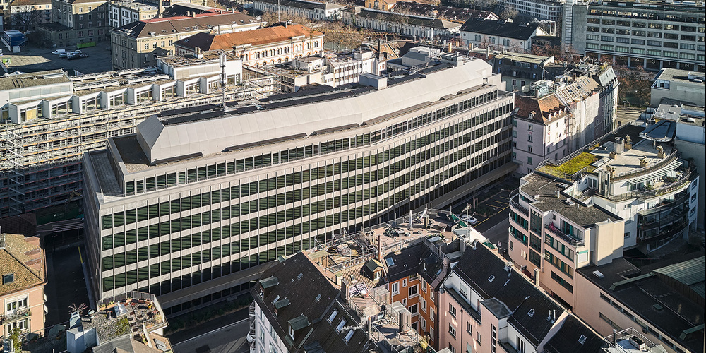 Das Geschäftsgebäude in zentraler Lage in Zürich wurde 1980 erbaut. Swiss Prime Site Immobilien erwarb den Bau 2018 und liess das veraltete Bürohaus innen und aussen umfassend sanieren und in ein modernes Bürogebäude verwandeln. Die rund 15 000 m² Bürofläche werden fortan von der neuen Alleinmieterin Google Schweiz genutzt. Zur Gesamtsanierung gehörten die Erneuerung der Fassade und des Dachs sowie der gesamten Gebäudetechnik. Die Transformation der Liegenschaft wurde im Sinne der integralen Nachhaltigkeit und «Circular Economy» durchgeführt. So wurden alle abgebauten Materialien, wenn möglich, verändert, aufbereitet und am Objekt in neuer Form wiederverwendet. Dies sparte Transportwege, war ressourcen- und CO2-schonend und wahrte die bestehende Identität des Gebäudes innerhalb der Stadt. Das Ziel für den sanierten Bau war seine Zertifizierung nach Minergie und SNBS (Standard Nachhaltiges Bauen Schweiz). Dafür kamen unter anderem Photovoltaik sowie eine dynamische Verglasung zum Einsatz.