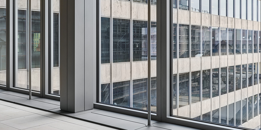 Verantwortlich für die Entwicklung der Neuprofile und der Unterkonstruktion für die Fassade war die Aepli Metallbau AG, welche die total 1082 Stück Fassadenelemente vom Erdgeschoss bis zum sechsten Obergeschoss auch produzierte und vor Ort montierte. Alle Elemente wurden pulverbeschichtet.