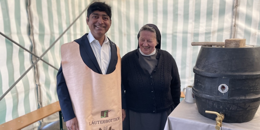 "Am Oktoberfest in München habe ich schon einmal gesehen, wie es läuft", erklärt er. Dennoch habe er sich zur Sicherheit am Abend zuvor noch einige Youtube-Videos über Fassanstiche angeschaut. Das Publikum lacht und applaudiert für die herzlich-charmanten Pater, der sichtlich etwas nervös ist und durchaus über sich selbst lachen kann. "Jetzt möchte ich mit eurer Hilfe und Gottes Segen diese Aufgabe schaffen", sagt Pater Kiran, greift zum Holzhammer und schlägt mit der Unterstützung des Publikums einmal auf den Zapfhahn ein. Unter Applaus der Besucher/innen läuft der goldgelbe Gerstensaft aus dem Hahn - der 17. Klostermarkt ist offiziell eröffnet!