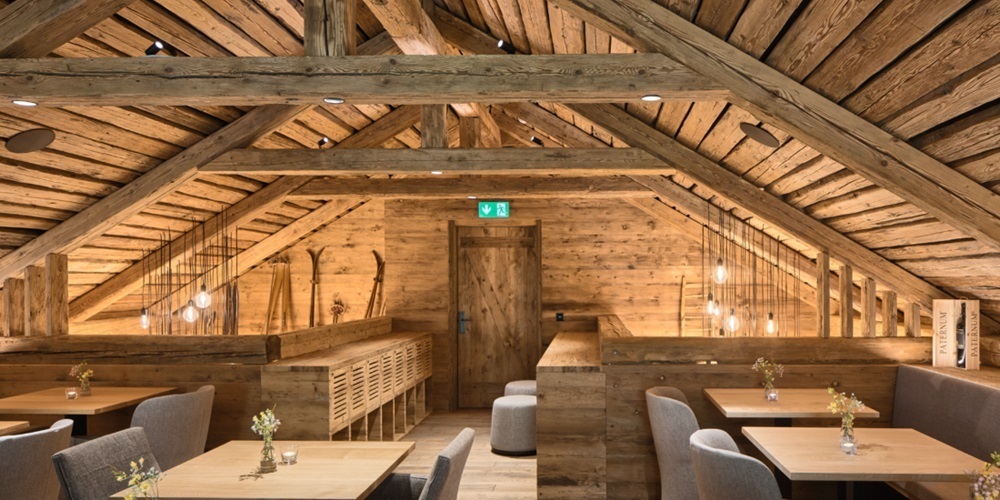 Restaurant Schamuela, Lenzerheide: Nachträglich eingebauter Dachstuhl im "Heuboda" komplettiert den Scheunencharakter.