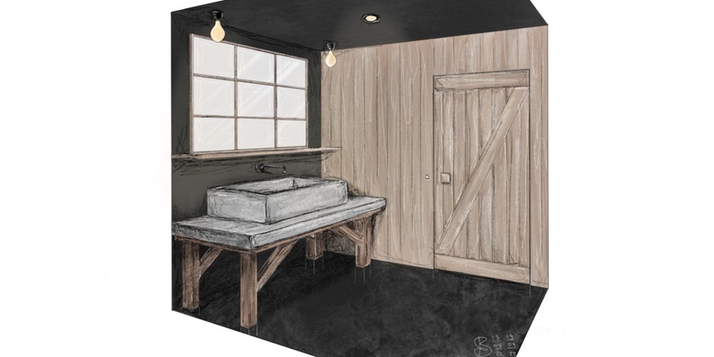 Visualisierung Vorraum Toiletten im OG mit Holztrennwand und integrierter Türe in Altholz, angelehnt an die Holzbauweise. Bild: Larissa Brühwiler-Eberle5 / 6 -