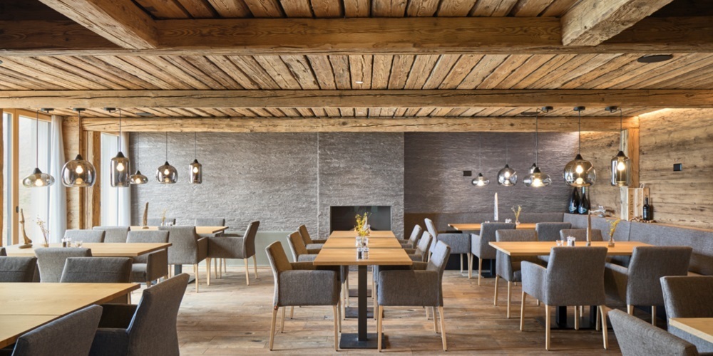Das gesamte Holz der Verkleidungen ist originales Altholz aus Fichte/Tanne/Kiefer, welches aus den benachbarten Ländern stammt. Die handbehauene und gebürstete Oberfläche ist dem alten Kuhstall nachempfunden und verleiht dem Restaurant den gewollt urigen und gemütlichen Charakter. Dank der unbesäumten Deckenbretter und dem dadurch entstandenem Abstand, konnte auch die Akustik elegant gelöst werden. (Quelle: prixlignum.ch)