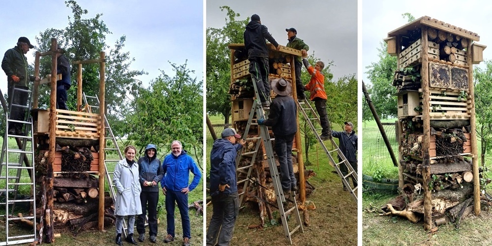 Bei trüber Witterung trafen sich am Samstagvormittag zahlreiche Helferinnen und Helfer an der Rütistrasse in Oberarnegg. Die Gruppe setzte sich zusammen aus ortsansässigen Oberstufenschülern, Lernenden, Familien, Vertretern des Vernetzungsprojekts, sowie Behördenvertretern der Projektgemeinden Gossau, Andwil und Gaiserwald. Unter fachkundiger Anleitung wurde fleissig Material bereitgestellt für das Befüllen der verschiedenen Stockwerke. Gleichzeitig konnte das Gerüst des zukünftigen Lebensturms im Boden verankert und die verschiedenen Stockwerke eingebaut werden. Besonders wurde darauf geachtet, dass ausschliesslich natürliche Materialien zum Einsatz kamen und nur einheimisches Holz verwendet wurde.
