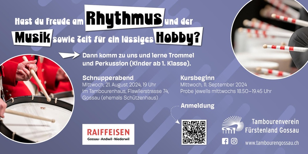 "Hast du Freude am Rhythmus und der Musik sowie Zeit für ein lässiges Hobby? Dann komm zu uns und lerne Trommel und Perkussion."