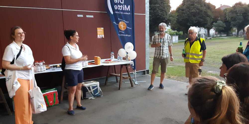 Am Treffpunkt bei der Badi konnte gleich der Stand des Baus der Sportwelten in Augenschein genommen werden. Weiter ging es ins Oberdorf und hoch zum Schloss Oberberg, einem der ältesten Gebäude und Wahrzeichen von Gossau. Mit Blick auf das Industriegebiet Ost wurde bewusst, wie sich Gossau von einem landwirtschaftlich geprägten Dorf zu einer Industriestadt entwickelt hat. Beim Ausblick von der Grillstelle „Tisch und Bänk“ wurde erklärt, dass die Autobahn aufgrund von Einsprachen nicht gerade und ganz nahe, sondern in einem Bogen mit nötigem Abstand an Gossau vorbei gebaut werden musste. Dabei wurde auch die Entwicklung der Industrie West in der Sommerau zwischen der Stadt und der Autobahn sichtbar. Über den Gröbliplatz ging es nochmals hoch zum Stadtbühlpark, der im Gegensatz zu früher nun in einem Dornröschenschlaf verweilt. Zurück ging es nach zwei Stunden zur Markthalle, wo bei einem wohlverdienten und reichhaltigen Apéro der Abend mit angenehmen Gesprächen mit Blick auf die kommunalen Wahlen ausklang.